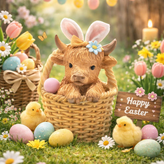 The Eggs-traordinary Easter Highland Cow In Basket Figurine
