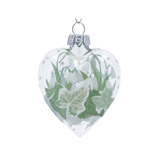Gisela Graham Glass Snowdrops & Ivy Heart Christmas Bauble