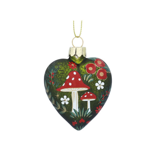 Gisela Graham Glass Antique Green Heart w Toadstools Christmas Bauble