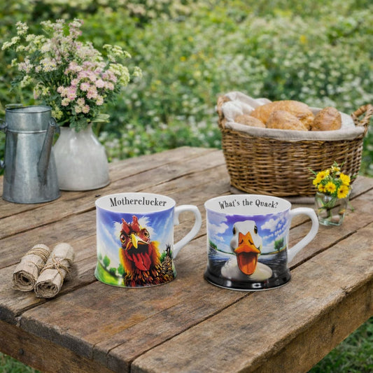 Eoin O'Connor Beyond the Herd Set 2 Cappuccino Mugs Hens & Donkey